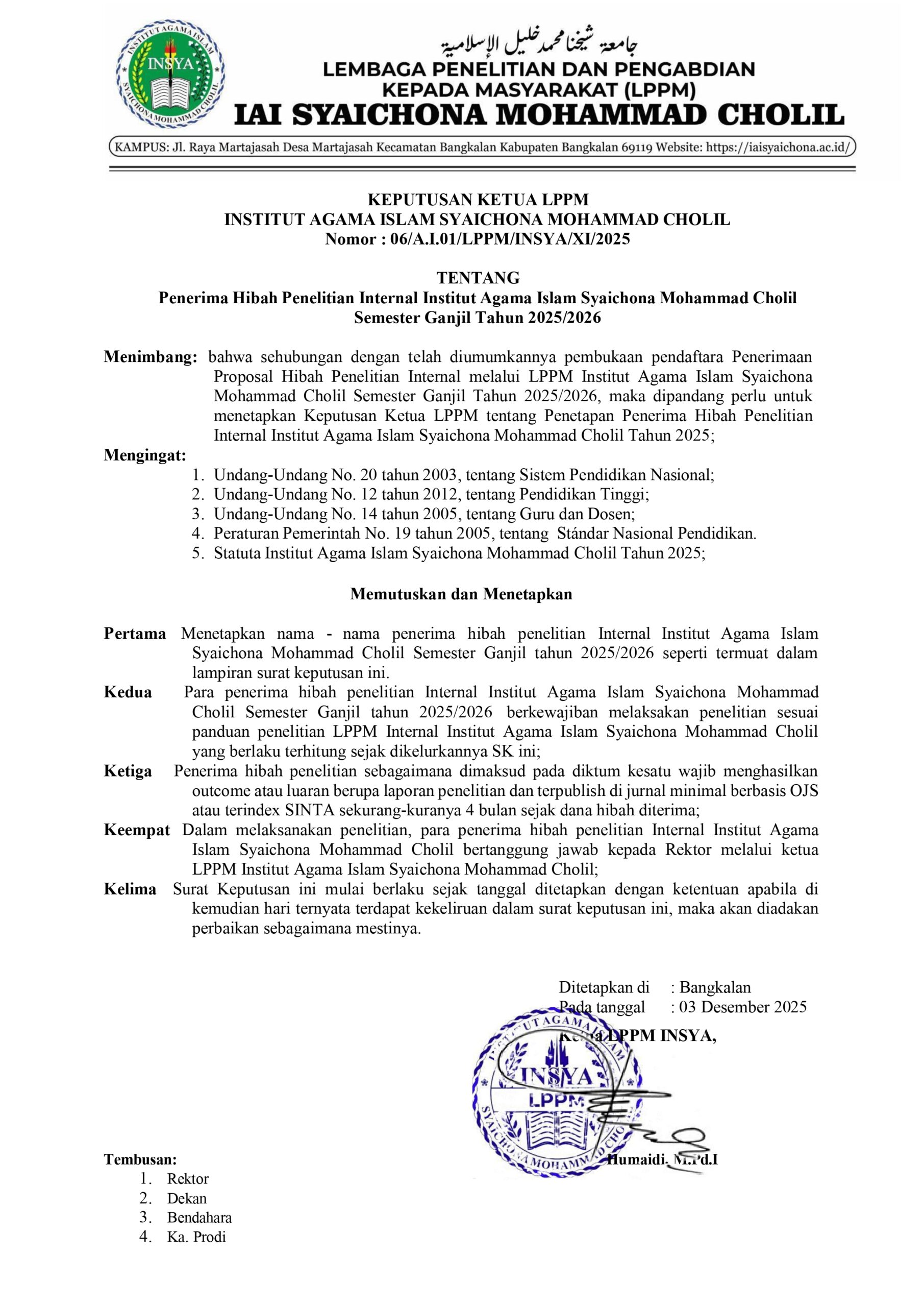 Lampiran SK LPPM Penerima Hibah Penelitian Internal Institut Agama Islam Syaichona Mohammad Cholil Semester Ganjil 2025-2026: https://drive.google.com/file/d/1EZDaW310f639LB-FX6tyfJRULQZ8_kwr/view?usp=sharing